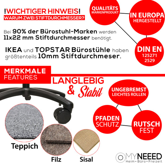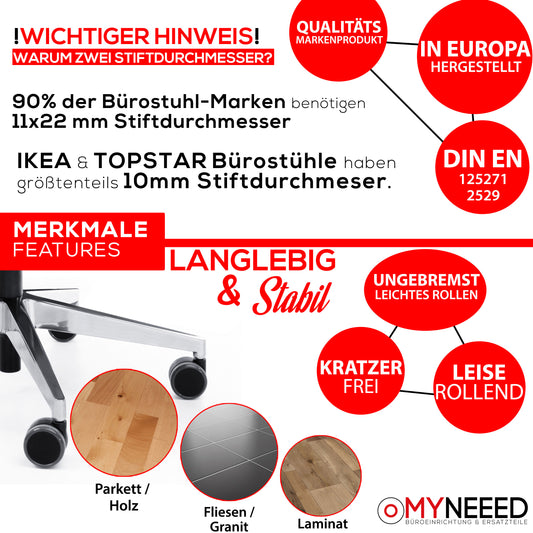 Universal Bürostuhl Rollen ohne Stifte, mit 10mm & 11mm Stifte